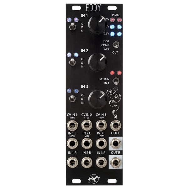 Eddy is a three channel stereo CV controlled mixer with sidechaineable compression and distortion, designed as a compact submixer. It also has normalized feedback paths for more experimental tone shaping, no input mixing, and percussion synthesis workflows.